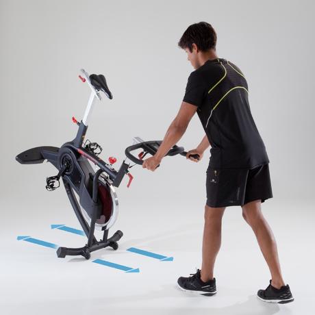 Стабилен, удобен и ергономичен спиниг байк, предлагащ плавно въртене на педалите благодарение на трансмисионния ремък и маховика 20 кг.