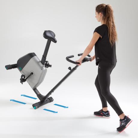 Велоергометърът има колелца за транспортиране в предната част. За да го преместите, застанете пред уреда. Стабилизирайте го с крак и натиснете кормилото, за да преместите тежестта върху колелцата. След това започнете бавно да го придвижвате в желаната посока.